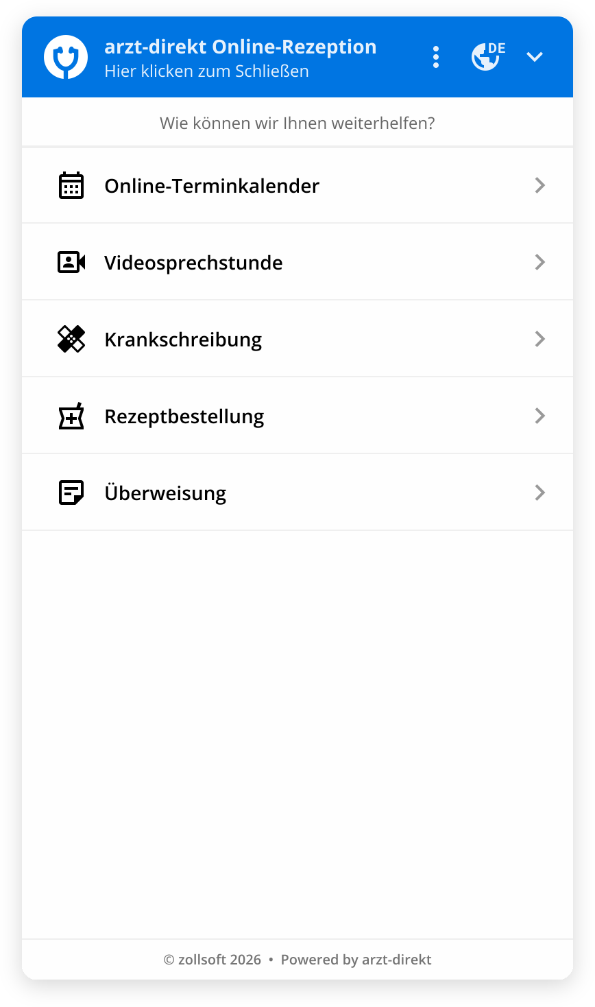 - Überweisung: Einfache Abfrage, welche Überweisung zu welchem Facharzt benötigt wird